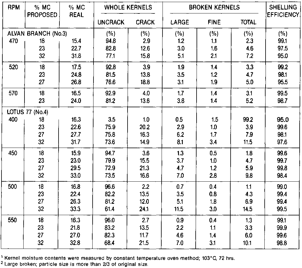 Shelling actions can be obtained by machine adjustment that will remove all kernels. However, any adjustment must also be considered in terms of the kernel crackage which results. The more severe the shelling action, the greater will be the crackage.