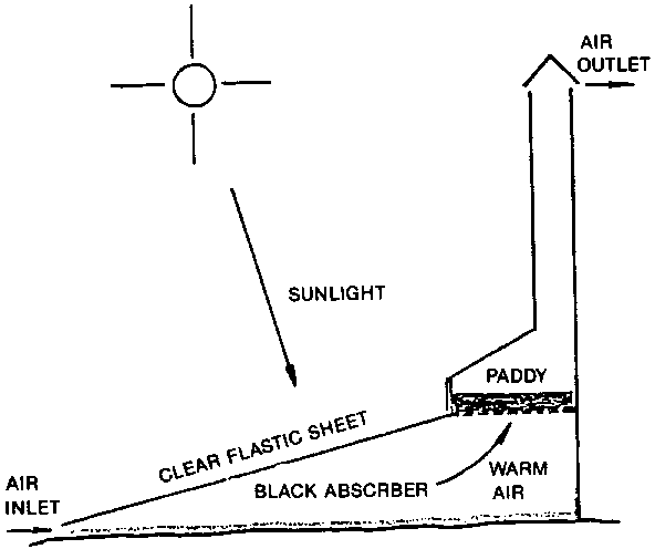 The, Asian Institute of Technology (AIT) has developed a low cost solar dryer for paddy. It consisted of a solar air heater, a box for the grain bed, and a chimney giving a tall column of warm air to increase the convection effect. Clear plastic sheet covering the grain bed allows it to be heated from above by the sun while protecting it from rain. Black plastic sheet is used to cover the ground and serves as heat absorber (Fig. 1. Design concept of a solar dryer). The construction cost of AIT solar dryer ranges from 4,000-5,000 baht dependent on the availability of the materials in each location. The dryer is capable of drying one metric ton of paddy. The drying period depends on the availability of sunlight. Life expectancy of the dryer is one year.