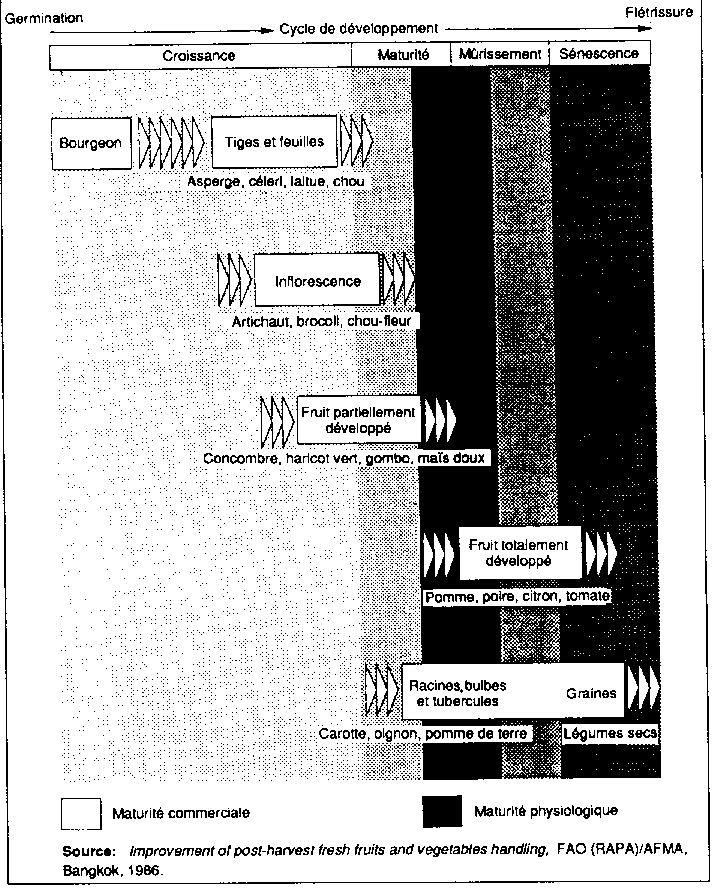 Un moment critique pour les producteurs de fruits et légumes est celui où ils doivent décider le moment de la récolte. Normalement, un produit frais, quel qu'il soit, est prêt à être récolté lorsqu'il a atteint les conditions idéales pour la consommation. C'est ce qu'on appelle généralement la maturité de récolte. Ce mot «maturité» peut prêter à confusion étant donné qu'au sens botanique il désigne l'époque à laquelle la plante a achevé sa croissance (croissance végétative) et est parvenue au stade de la floraison et de la production des semences (maturité physiologique), comme représenté à la figure 2. La maturité de récolte désigne alors l'époque à laquelle le «fruit» est prêt à être récolté et doit tenir compte du délai d'acheminement jusqu'au marché et des conditions du transport. En raison de ce décalage, les produits sont souvent cueillis avant maturité complète.
