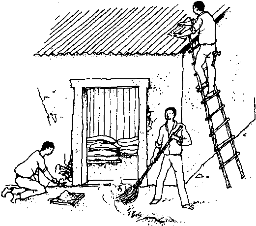 If it is not possible to put a covering sheet over the grain the building should be sealed thoroughly before fumigation. Alternatively, if feasible, a sheet should be put over the whole structure before fumigation.