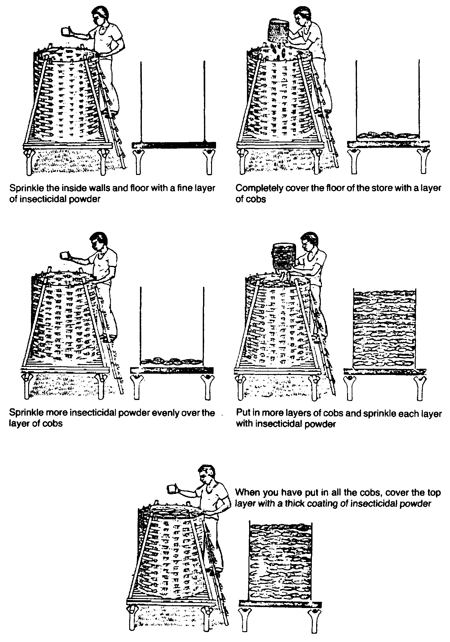 The required amount of insecticide for spraying can be mixed in any convenient quantity of water; for example, in using Actellic 25 ec to spray a crib, either a Shelltox-type hand pump (in which case a 60-ml solution in 250 ml of water is required) or a cp3-knapsack sprayer (for which 60 ml might be mixed with 51 of water) may be used. In both cases, the whole spray solution would be applied to 1 tonne of produce.