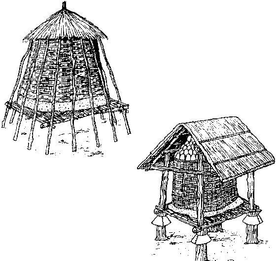 Round, slatted-wall structures are extensively used for drying in the humid tropics. They range from 1 to 3 m in diameter and are up to 2.5 m high. Platforms are used to store un-dehusked maize cobs, often arranged in a specific pattern, and a fire may be lit beneath the platform. A thatched roof provides protection from rain.
