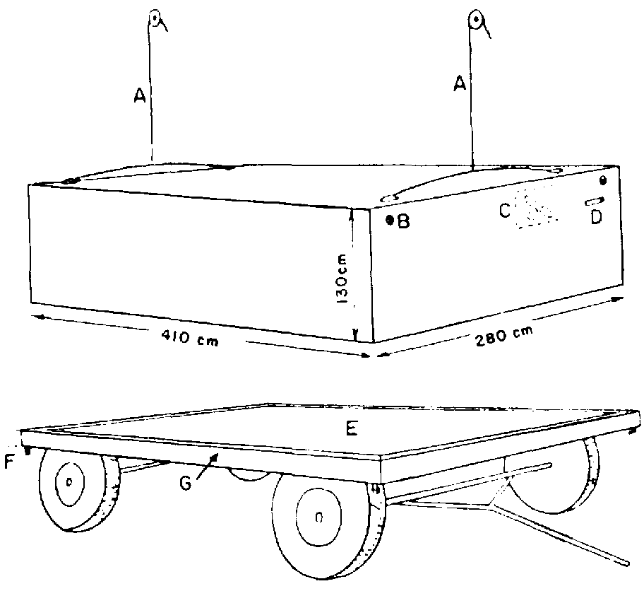 Fumigation chambers which can be readily moved from one place to another provide a flexible means of disinfestation. Such chambers, like the one illustrated in Figure 26, are often similar in construction and operation to stationary chambers, but of the lightest possible weight. The portable chambers shown in Figures 23 and 26 have already been discussed. Two other types, making use of a convenient water seal for closure, are described below. These may only be used for fumigants such as methyl bromide and ethylene dibromide which are only slightly soluble in water. The actual surface of water exposed to the fumigant is small and does not affect the gas concentration significantly.