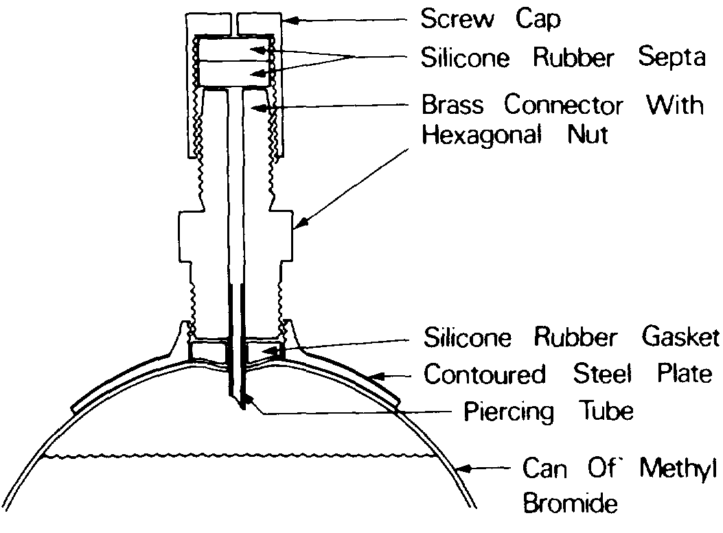 To pierce the can, the connector is screwed into the threaded hole of the contoured plate until finger tight and then given a quick half turn with a wrench to make the puncture and simultaneously to provide a gas tight seal as the gasket is compressed against the can. Can tapping devices such as this are available from scientific suppliers or they can be made in a machine shop. It should be noted that the use of materials that do not react with methyl bromide, e.g. neoprene, silicone rubber and brass, is important; aluminium fittings should nut be used.