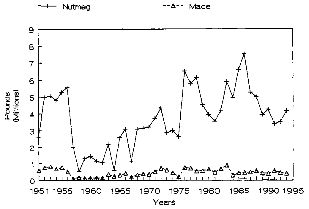 Tables 3 and 4 and fig. 5 and 6 compare the production figures and export in pounds for nutmeg and mace for the period 1951 -1993.