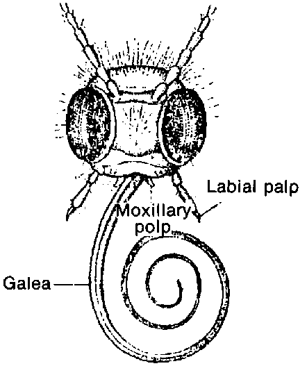 Mandibles are usually absent and rarely functional, while the maxillae (galeae) are greatly elongated, usually grooved internally and fastened together by interlocking spines to form the tubular haustellum (proboscis) which is coiled beneath the head. In some cases, the proboscis is vestigial or absent, therefore adults cannot feed and subsist on food reserves stored when they were larvae. Labium is small, usually with well developed 3-segmented palpi.