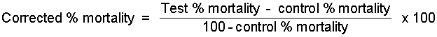 It should be noted that the mortality observed in bioassay tests may not all be due to the pesticide, since handling and holding operations may also be lethal to some of the arthropods. This can be checked by using batches of controls, which are treated in the same way, except for use of pesticide. If it is assumed that deaths from handling and from the pesticide are quite independent and uncorrelated, then a correction for control mortality can be made by the use of Abbott's formula, as follows: