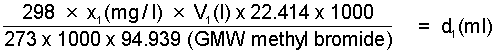 Step 1. Determine the volume, d1(ml) of methyl bromide vapour at 25°C required to obtain a concentration of x1(mg/l) in a desiccator of volume V1(l)
