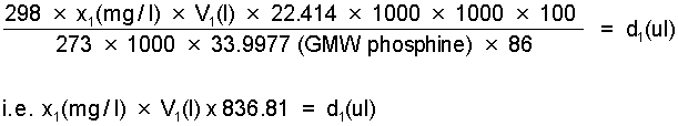 An 86% phosphine source is equivalent to a concentration of 1.195 ug/ul. Thus if concentration is expressed in terms of (ug/l) the equivalent of steps 1 and 2 in the foregoing is given by