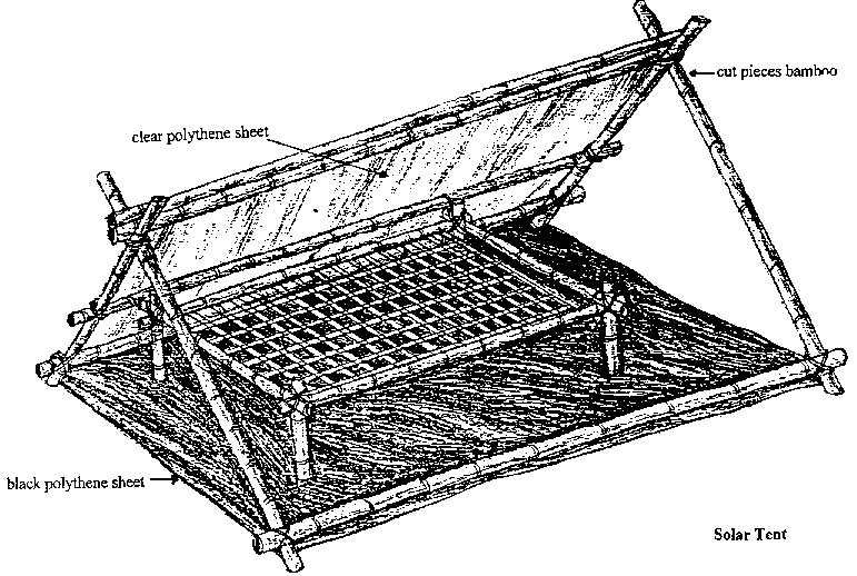 The solar tent works on the same principle as the solar drying cabinet but is lighter in weight, cheaper to make and easier to carry from place to place. The tent frame is made from bamboo or 2.5 cm square pieces of wood, secured in an A frame arrangement. The clear plastic sheet is secured over the A frame. The material to be dried is placed on a "table" made out of a bamboo frame and fine mesh. The table is placed on a sheet of black plastic and covered by the tent frame.