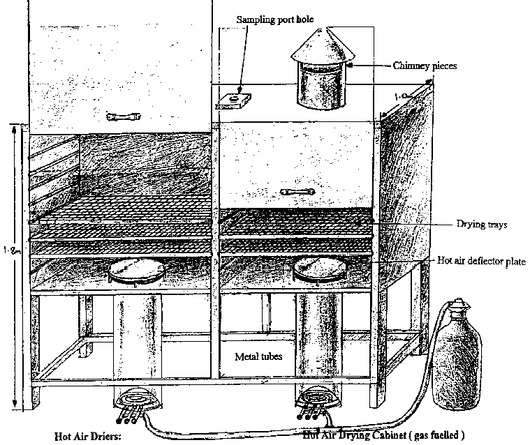 The hot air drying cabinet illustrated below, is made out of wood and metal. The main frame of the cabinet is 5cm square wood with 2cm thick wooden side panels. Ideally all the wood used should have been pre - treated to prevent the risk of fire. The sliding doors are made of 1.25cm thick plywood. The chimney pieces, deflector plates and tubes leading from the gas burners are made of 1 mm thick galvanised sheet steel. The screws used to secure the metal pieces onto the wooden frame are made of brass to prevent rusting over time. The trays are made of a thin wooden frame with metal mesh centre. The trays slide into the cabinet along rails made of wooden rods. The cabinet should be brushed with linseed oil from time to time to counteract the effects of over drying and cracking.