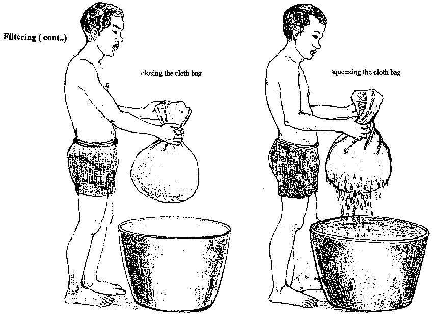 FILTERING: pass material slowly through a device which permits fluid to pass through but retains solid particles. Equipment used: fine piece of muslin cloth or pillowcases. The fabric used should be fine enough to allow the liquid to pass through but retain the coarser material or pulp.