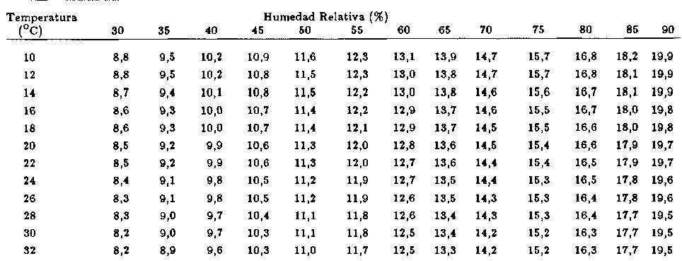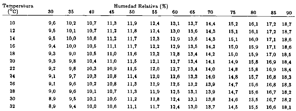 En las tablas presentadas se observa la influencia de la temperatura. Se ve que, con la misma humedad relativa, a medida que aumenta la temperatura disminuye el contengo de humedad de equilibrio. Con la humedad relativa ocurre lo contrario, es decir, que al aumentar la humedad relativa aumenta también el contenido de humedad de equilibrio.