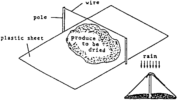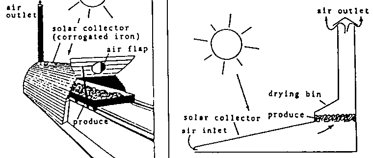 Bush dryers are constructions built in the form of a tunnel made of mud or metal drums, and through which hot air is conducted with the aid of an open fire. The produce, spread out on a platform positioned above the tunnel, is dried by heat radiation. Adequate drying can, however, only take place if the produce is spread out in layers no thicker than 2 3 cm. As there is generally no possibility of regulating the heat, overheating and damage to the produce may easily result.