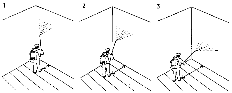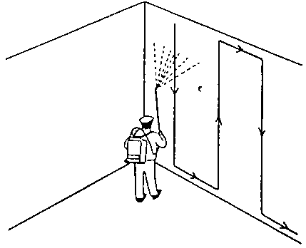 Standing too far away from the wall will mean that the insecticide spray only partly reaches the surface of the wall. Standing too near to the wall means that a large amount of insecticide will be concentrated on a small area, causing the liquid to run down the wall. Both of these faults must definitely be avoided. The roof can be best treated from the bag stacks if no motor operated high pressure pump sprayer is available.