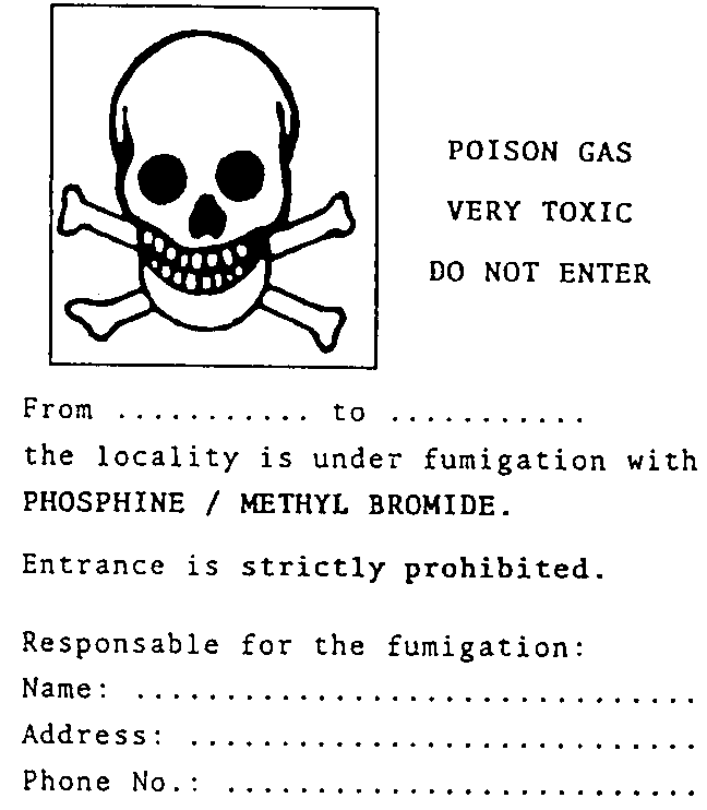 Due to the high toxicity to mammals, the maximum levels in the air of 0.1 ppm for phosphine and 5 ppm for methyl bromide must not be exceeded. If the readings show the levels to be higher access to the store is not allowed without mask.