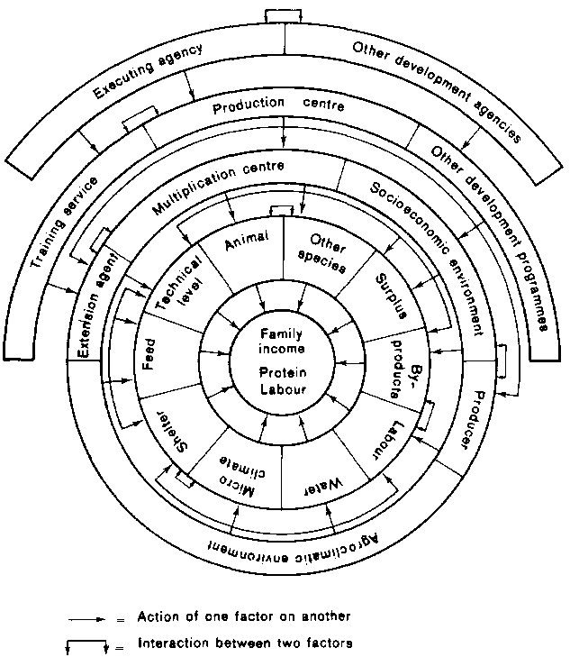 The first circle around the centre shows the factors directly affecting achievement of the objectives. Double arrows show how several factors interact at the same level. The second circle contains a second series of factors. The plain arrows represent the action of one factor on another. The system considered here is only a sub-system, one component of a global system of rural development, and links with the outside are barely indicated in the diagram.