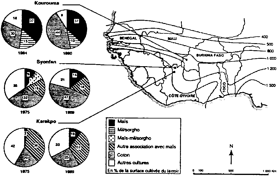 L'exemple du terroir de Daboura montre que la diffusion du maïs atteint des zones très septentrionales. On constate aussi que l'expansion du maïs intervient parfois sous forme associée au sorgho et non en culture pure (un cas au sud du Mali et un cas au Togo). Le trait le plus marquant de l'évolution des systèmes de culture est l'expansion du cotonnier; la diffusion du maïs apparaît comme une dynamique connexe (figure 2).