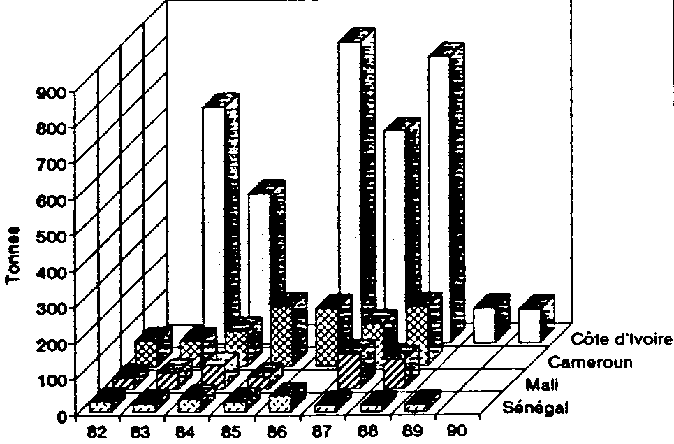 Pour les quatre pays susmentionnés, les sociétés cotonnières avaient pratiquement l'exclusive de l'encadrement des céréales et de la distribution des intrants en zone de savane, au moins jusqu'en 1992. Les réalisations de ces sociétés constituent donc de bons indicateurs du niveau d'intensification de la maïsicuIture.