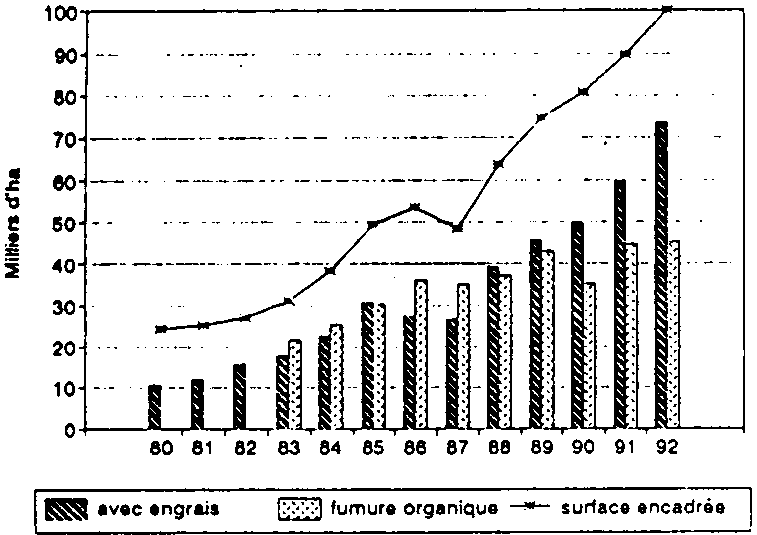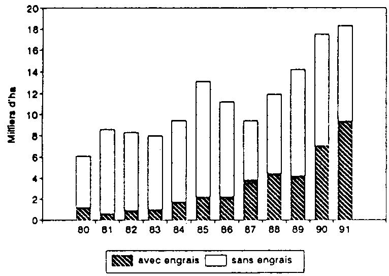Au Sénégal et au Cameroun, l'utilisation des engrais apparaît limitée (moins de 10 000 ha en 1991) du fait d'abord de la faible extension de la surface en maïs encadré. On constate une progression rapide de la surface avec engrais au Sénégal, contrairement au cas du Cameroun où les engrais ont pourtant été subventionnés et fournis à crédit jusqu'en 1991.