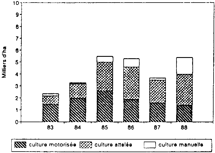Figure 13. Superficie encadrée en maïs par la CMDT (Mali) selon le mode de préparation du sol.