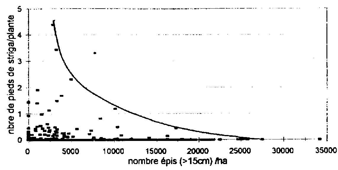 Les résultats permettent de noter une relation négative nette entre le taux d'infestation (exprimé en pieds atteints par segment de ligne de maïs) et le rendement en grains (figure 7, courbe enveloppe supérieure).