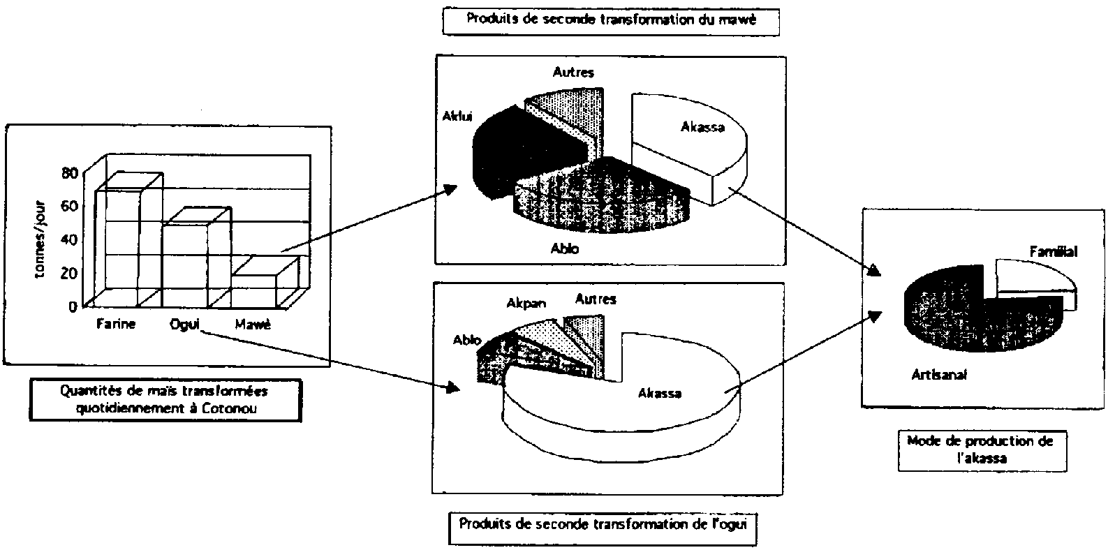 Dans le golfe du Bénin, et à Cotonou en particulier, près de 50 % du maïs est broyé sous forme humide afin de donner des pâtes fermentées appelées ogui et mawè (figure 7) qui sont la base de nombreux plats. Le mawè occupe une place particulière; en effet, 50 % du mawè fabriqué est commercialisé comme produit intermédiaire (tableau V).