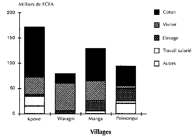 Dans la zone cotonnière, le maïs constitue la principale source de revenu pour les exploitations agricoles ne produisant pas de coton, en particulier au sud du pays. Dans certains cas, même lorsque le paysan produit du coton, on enregistre des ventes de vivriers pour constituer un revenu complémentaire. D'une façon générale, les vivriers (dont le maïs) participent à la formation du revenu des UR Il faut préciser toutefois que les enquêtes sur les flux monétaires des UP étudiées montrent que les recettes agricoles sont constituées en grande partie par la vente du coton dans l'ensemble de la zone cotonnière, à l'exception de la région centrale (figure 3).