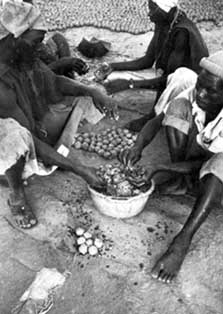 Vegetables are planted in these gardens during the dry season. Regular and careful watering is then carried out, by hand, from the riverbed. Onions mature quickly in the shallow soil. After harvesting the bulbs are crushed into pulp, squeezed into balls, and dried on the bare rock close to the gardens, ready for marketing.