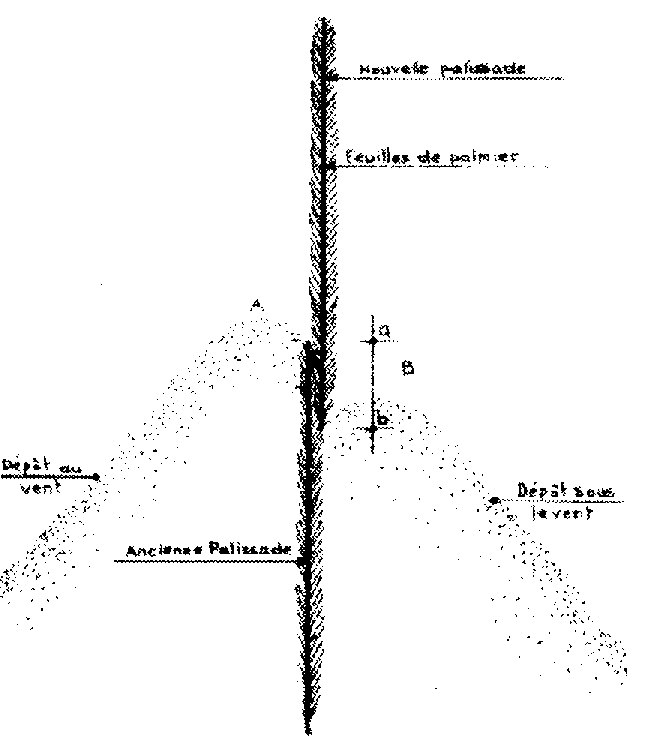 - Principe d'action: La palissade repose sur le principe d'obstacle qui, dressé à l'encontre du vent, en diminue la vitesse entraînant ainsi la réduction de la capacité de charge, donc, le dépôt de sable.