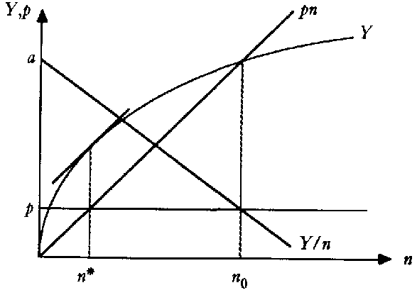 Let us now consider another example of a fishery where the total amount of catches depends on the number of fishing boats. Let Y stand for total catches and n for the number of boats operated. For the sake of simplicity, let us assume that, in the relevant range, Y= F(n) can be approximated by the following functional form: Y = an - bn2. In this situation, the openaccess equilibrium will be such that Y/n, the average catch per boat, is equal to p, the rental price of a boat. In other words, open access is characterized by n0 boats, with n0 such that: n0 = (a - p)/b.