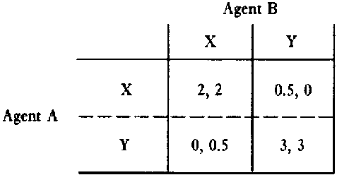 Let us at this stage present a very simple example derived from that model with a view to highlighting what is meant by 'co-ordination failure'. Suppose a CPR exploited by two agents, agent A and agent B. They have to choose between two different techniques, X and Y. where X is inefficient compared to Y but where, for technique Y to be advantageous, it must be used by both agents simultaneously. In other words, the two techniques are interdependent in such a way that Y appears as a superior technique to an agent only if the other already uses it. Otherwise, X is chosen. By co-ordination failure, we mean the case where both agents do not choose the superior technique Y because they fail to communicate and co-ordinate. They are both stuck into an inferior Nash equilibrium, while another Pareto-dominating Nash equilibrium exists.