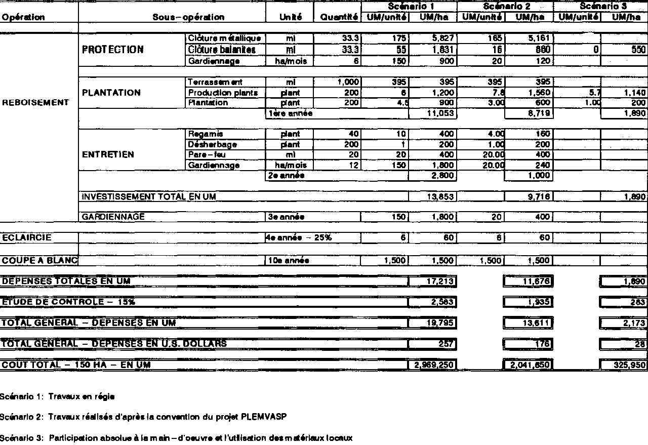 En analysant les résultats des projets de reboisement avec les standards mentionnés ci-haut, le projet n'est viable qu'avec le scénario 3, soit avec la participation absolue à la maind'oeuvre et l'utilisation des matériaux locaux. Les analyses comportent trois scénarios et trois valeurs actualisées: 5%, 8% et 12%. La valeur actualisée nette qui correspond au taux d'intérêt existant est celle de 12%.