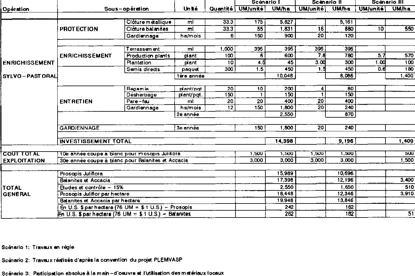 La viabilité de l'enrichissement sylvo-pastoral a été analysée sur trois scénarios, utilisant trois valeurs actualisées: 5%, 8% et 12%, sur le Prosapis Juli-Flora, les balanites Aegyptiaca et l'Acacia. Les standards utilisés sont ceux établis par le projet.