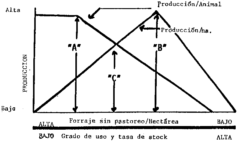 El punto "B", como se ilustra en la figura 8, indica cuándo se ha alcanzado la producción animal máxima por hectárea. Este punto siempre se alcanza cuando el forraje remanente por hectárea es menor que el punto donde se alcanza la producción óptima por animal (punto "A"). Sin embargo, en el punto "B" tanto el rendimiento individual de los animales como la vegetación del pastizal resultan con estrés debido a la sobreutilización. Si ello continúa, no durará mucho la ventaja de lograr la producción máxima por hectárea porque la vegetación y el suministro de forraje se deteriorarán y el punto "B" descenderá en la escala de producción.