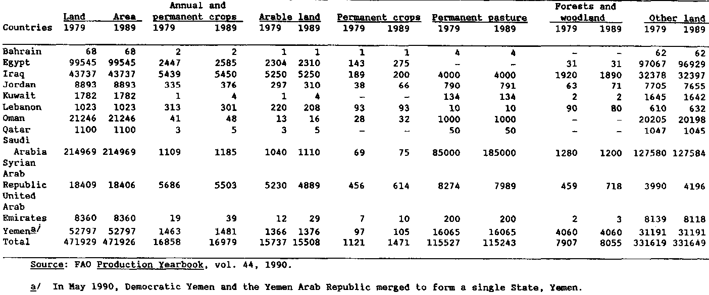 The ESCWA region covers an area of about 473 million ha distributed over 12 Arab countries, excluding Palestine. Table 1 shows areas of land categories and plant cover in all countries of the region.