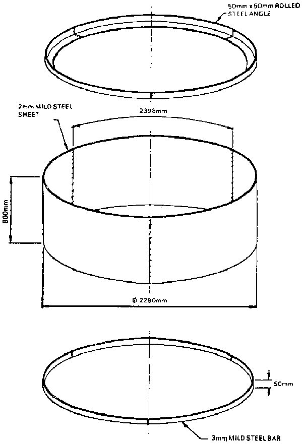 1. Cut six 2 398 mm lengths of 50 mm x 3 mm m.s. strip.2. Take three of these lengths to make the bottom ring. Bend each length to a radius of 1 145 mm.