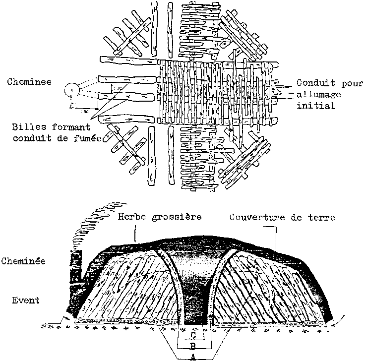 La meule est couverte avec de l'herbe et des broussailles, puis du sable ou de la terre limoneuse. La cheminée est placée sur le pourtour, comme le montre le schéma' l'ouverture à la partie inférieure étant en communication avec la base de la meule.