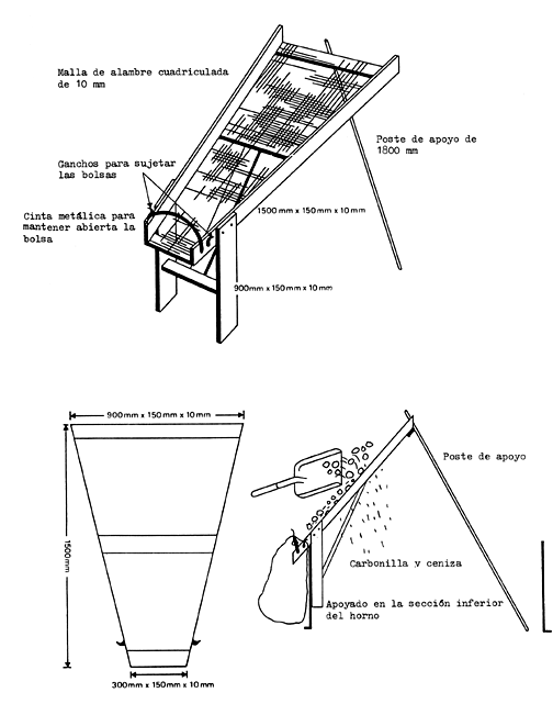 Se recomienda colocar la sección inferior del horno en el lado opuesto de donde se tira el carbón, y de charla para sostener el tamiz deslizador, de manera que no solamente aumentará la establidad del tamiz, sino que se reduce la cantidad de polvo que alcanza al obrero.