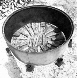 (e) se carga la sección inferior del horno con sucesivas capas de madera, llenando el máximo posible de los espacios libres y colocando las maderas de mayor diámetro hacia el centro del horno. Cuando la sección inferior está cargada y las superficies de las juntas del horno se han limpiado por raspaje, se rueda al costado, la sección cilíndrica de arriba, que luego se levan-ha, colocándola sobre la repisa de apoyo de la sección inferior.