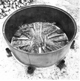 (b)Durante la carbonización, la madera se habrá reducido a alrededor de la mitad de su volumen original y será posible quitar la tapa y la sección superior, apenas el horno se enfría, quedando el carbón vegetal en la sección inferior.
