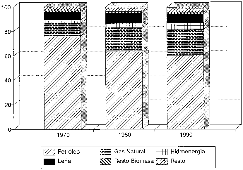 A nivel de Fuente, entre los años extremos citados, se observa la incorporación de la Geotermia y la Nuclear, pero en conjunto constituyeron en 1990 sólo el 0,52 por ciento de la OTEP.