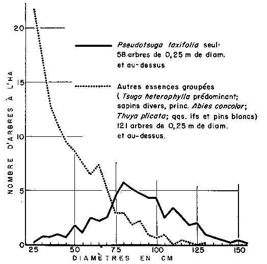 Une autre conséquence, d'importance sylvicole considérable, est que, d'une façon très générale, les peuplements d'âge moyen des essences jusqu'ici considérées comme précieuses - celles qui viennent d'être énumérées - manquent ou sont largement déficitaires. Le feu dans la forêt vierge, se reproduisait peut-être à intervalles relativement courts, mais sa distribution et son effet sur les différents éléments du peuplement étaient sans doute fort variables. Les arbres déjà suffisamment âgés pour être munis d'une écorce épaisse qui les protège contre les effets du feu, ou pour qu'un peuplement climatique, moins vulnérable à l'incendie ait pu se constituer sous eux, ont été sans doute épargnés. On ne s'expliquerait pas autrement la rareté des peuplements d'âge moyen de ces essences, et que les très gros arbres qui ont fait la renommée touristique des forêts du Nord-Ouest et la renommée commerciale de ses industries du bois, soient âgés de 200 à 300 ans et plus, et même parfois de plus de 1.000 ans en ce qui concerne la région des «Redwoods», Sequoia sempervirens (D. Don) Endl.