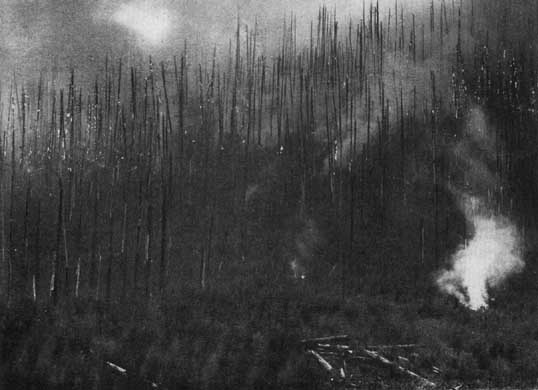 Le feu a joué, en effet, de tout temps, un rôle primordial dans la constitution de ces massifs. Il est inexact de prétendre que l'homme a apporté ce fléau avec lui. Sauf dans le cas de défrichement volontaire, le feu allumé par l'homme a pu également être combattu par lui dès que ces régions ont été peuplées. Le feu naturel, allumé par la foudre pendant les deux à quatre mois très secs qui caractérisent l'été dans tout le Nord-Ouest, susceptible de se propager sans contrôle sur d'énormes surfaces grâce à l'abondance des déchets qui couvraient le sol sous ces peuplements alors inexploités, a joué un rôle beaucoup plus important et, à de très rares exceptions près, est à l'origine de tous les peuplements vierges actuellement existants et de ceux qui existaient encore il y a cent ans.