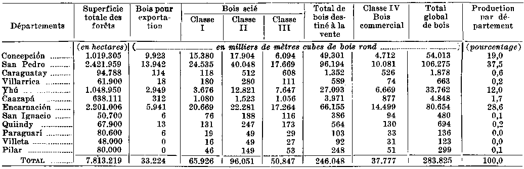 L'estimation approximative des ressources forestières de la région orientale du Paraguay situe aux environs de 7.813.619 hectares la superficie des terres forestières et le volume total des bois de tous types et de toutes qualités à 2.569.746.000 m³. Sur cette Quantité. il n'y a sans doute que 33.224.000 métres cubes de bois exportables à en juger par les standards et les méthodes d'exploitation existantes. Il est très probable que seul un quart de ce volume est exploitable à l'heure actuelle, le reste étant difficilement accessible du point de vue économique, étant donné le système existant d'exploitation et les moyens de transport démodés et coûteux.