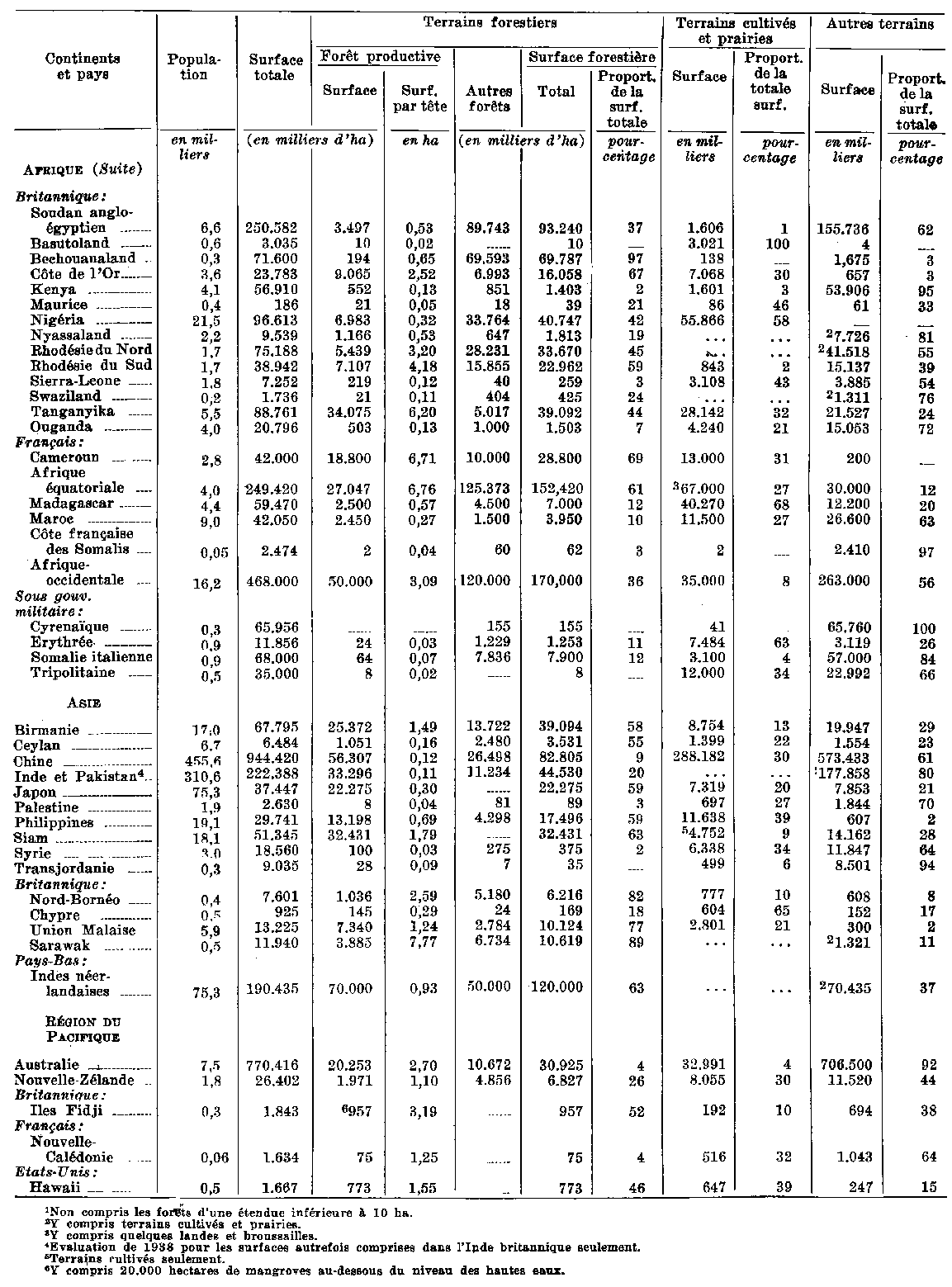 Pour apprécier l'importance relative des forêts dans un pays, il est nécessaire de connaître les étendues des terres cultivées, des terrains de parcours et des terrains qui ne sont pas utilisés pour une production quelconque. Il est nécessaire aussi de connaître la population dont la forêt est appelée à satisfaire les besoins. Les chiffres de population utilisés dans ce rapport ont été puisés à des sources officielles indépendantes du questionnaire forestier.