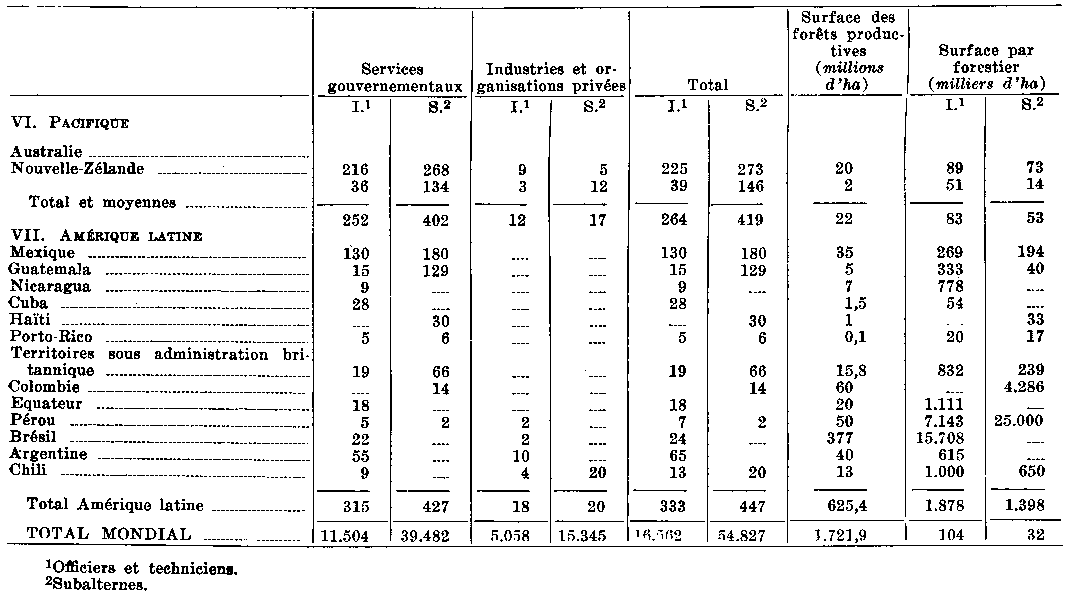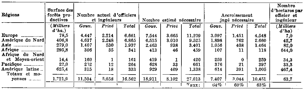 Seule la comparaison du nombre des forestiers avec l'étendue des forêts productives présente évidemment un intérêt. Il faut tenir compte, dans cette comparaison, que, pour l'ensemble du monde, 46 pour cent de l'étendue totale des forêts productives sont encore considérées comme inaccessibles. Toutefois, même les forêts inaccessibles, qui constituent des réserves pour l'avenir, nécessiteraient, en principe, certains soins, par exemple un certain degré de protection contre l'incendie.