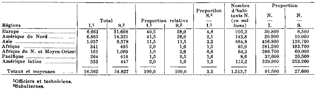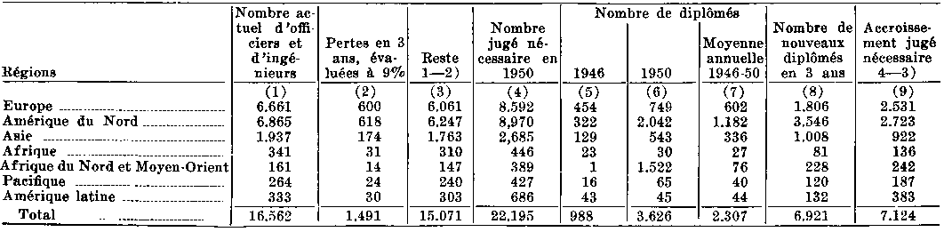 Par rapport à la moyenne des années 1935-1939, le nombre des diplômés, ingénieurs ou officiers. sortis des écoles en 1946, a sensiblement fléchi. Ce fléchissement est dû surtout à l'Amérique du Nord et a visiblement sa cause dans les perturbations apportées par la guerre au cours des études. Par contre, pour 1950, le nombre prévu sera plus de deux fois et demi supérieur aux moyennes 1935-1939, et plus de trois fois supérieur au chiffre de 1946.