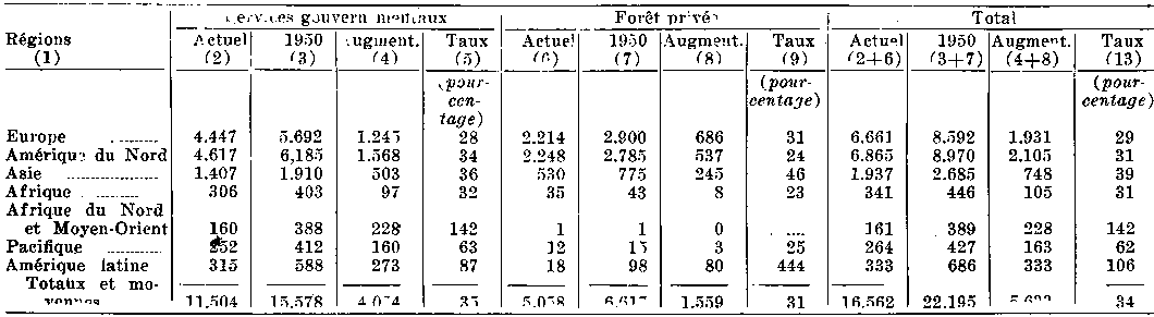 Tous les pays paraissent en fait désireux de compléter leurs services forestiers, et cette constatation est valable même pour les pays les plus pauvres en forêts, comme ceux du Moyen-Orient. Ce ne sont assurément là que des prévisions et bien des circonstances sont susceptibles d'empêcher les pays de les réaliser. Néanmoins :(voir Tableau II (B) ) dans le cas le plus favorable, il y aurait en 1950 environ un forestier technicien pour 78.000 hectares de forêts productives contre un forestier pour 104.000 hectares actuellement.