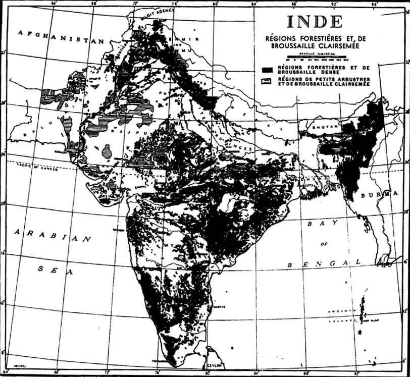 La répartition actuelle des forêts est également loin d'être satisfaisante pour répondre aux besoins des consommateurs ruraux. Les provinces situées au nord d'une ligne allant du golfe de Cambay à Calcutta sont particulièrement pauvres en forêts, à l'exception de certains bosquets de peu d'importance.